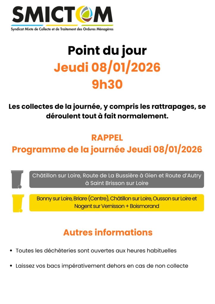 Depuis ce matin, les élus et les agents du SMICTOM sont en contact permanent avec le collecteur afin d’identifier les solutions permettant de rattraper les tournées non réalisées dans les meilleurs délais.