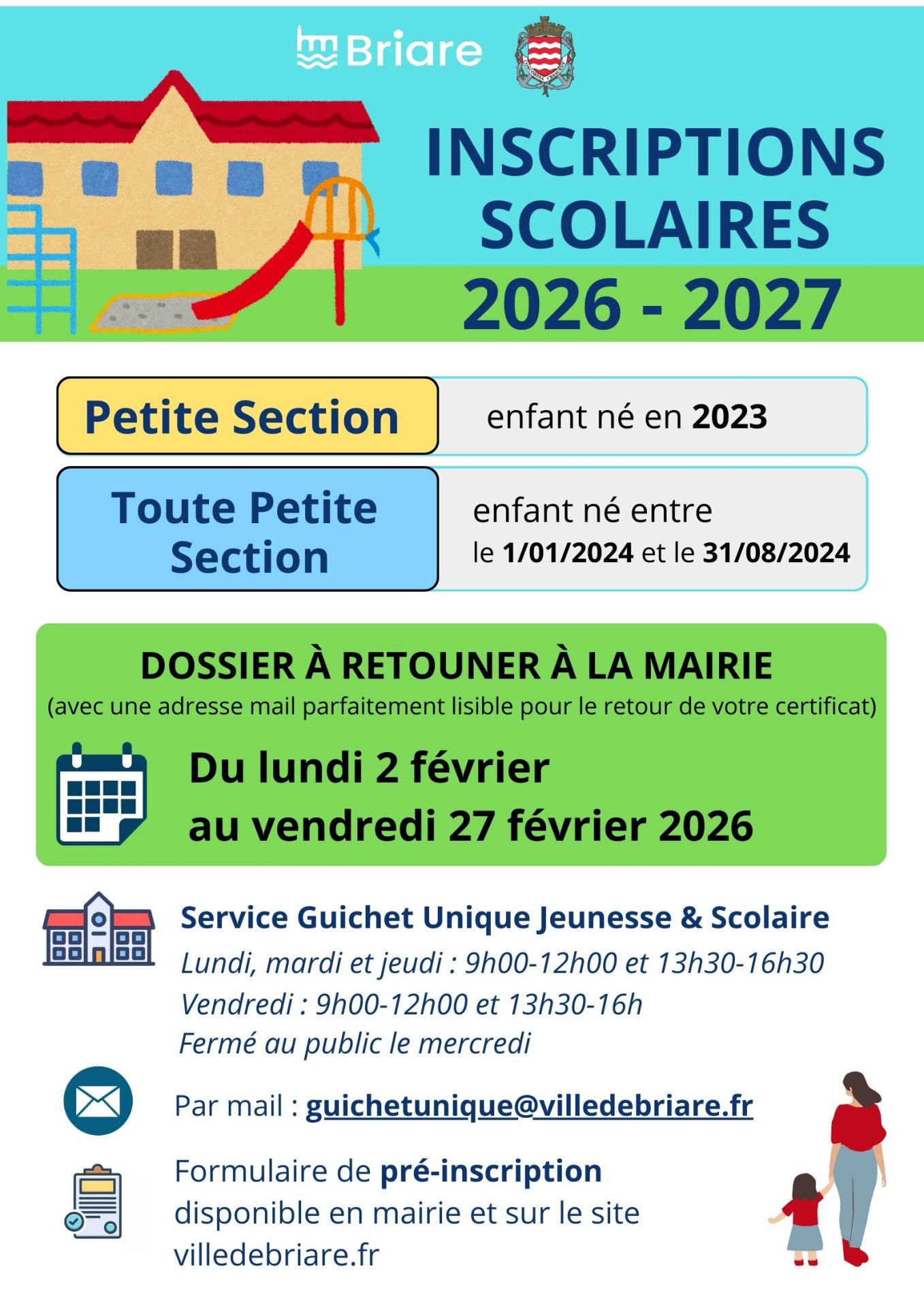 La Ville de Briare ouvre les inscriptions scolaires pour les enfants nés en 2023 pour la petite section et entre le 1er janvier et le 31 août 2024 pour la très petite section.