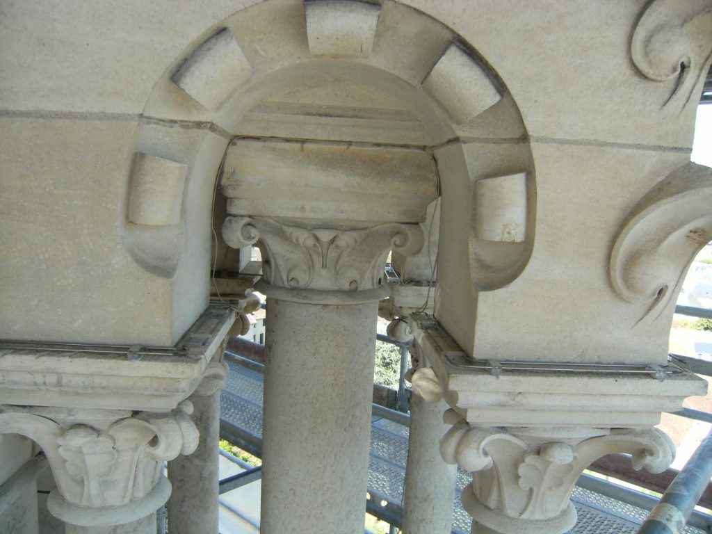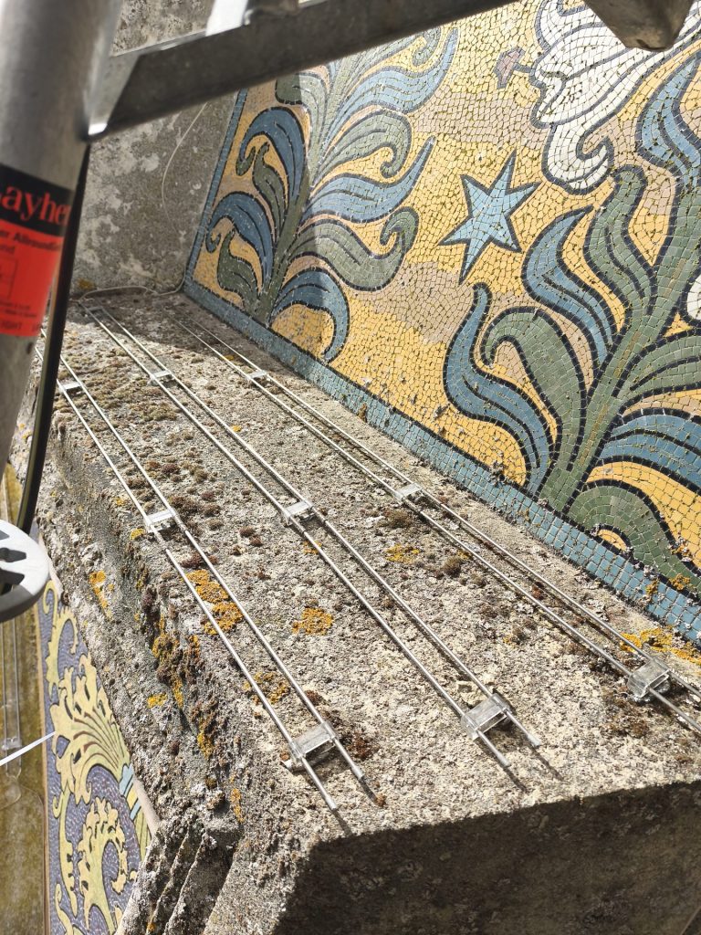 La 1ʳᵉ étape portera sur la façade et le clocher : nettoyage biocide pour éliminer les micro-organismes, restauration des joints des émaux, reprise de l’entourage des vitraux, remise en état de la toiture.